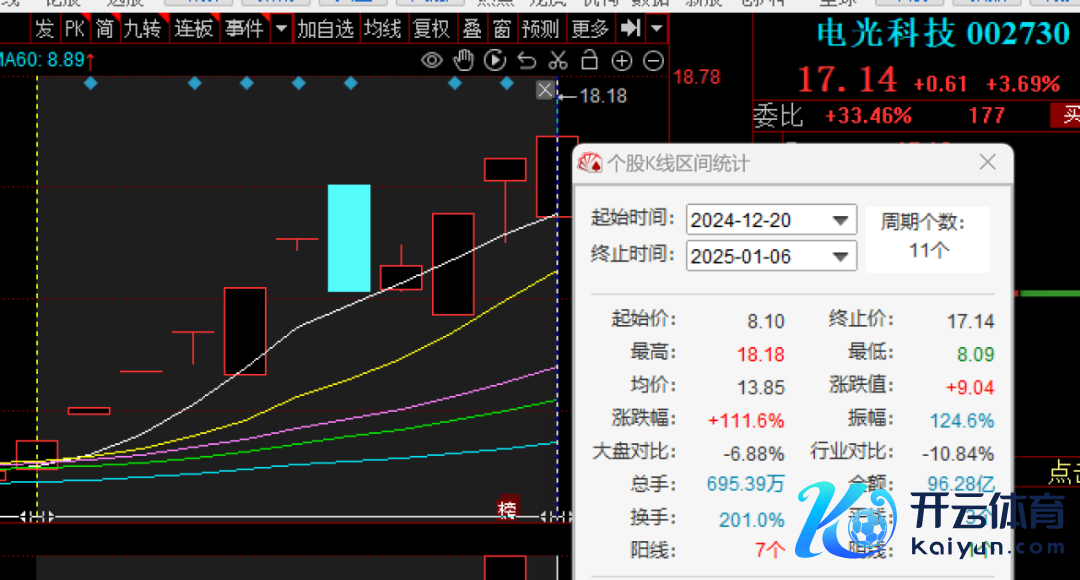 电光科技此轮飞腾始于旧年12月19日,当日股价上扬2.53%,报收8.1元/股。2024年12月20日—2025年1月6日这11个交游日内,电光科技累计斩获8个涨停板,区间累计涨幅111.6%。