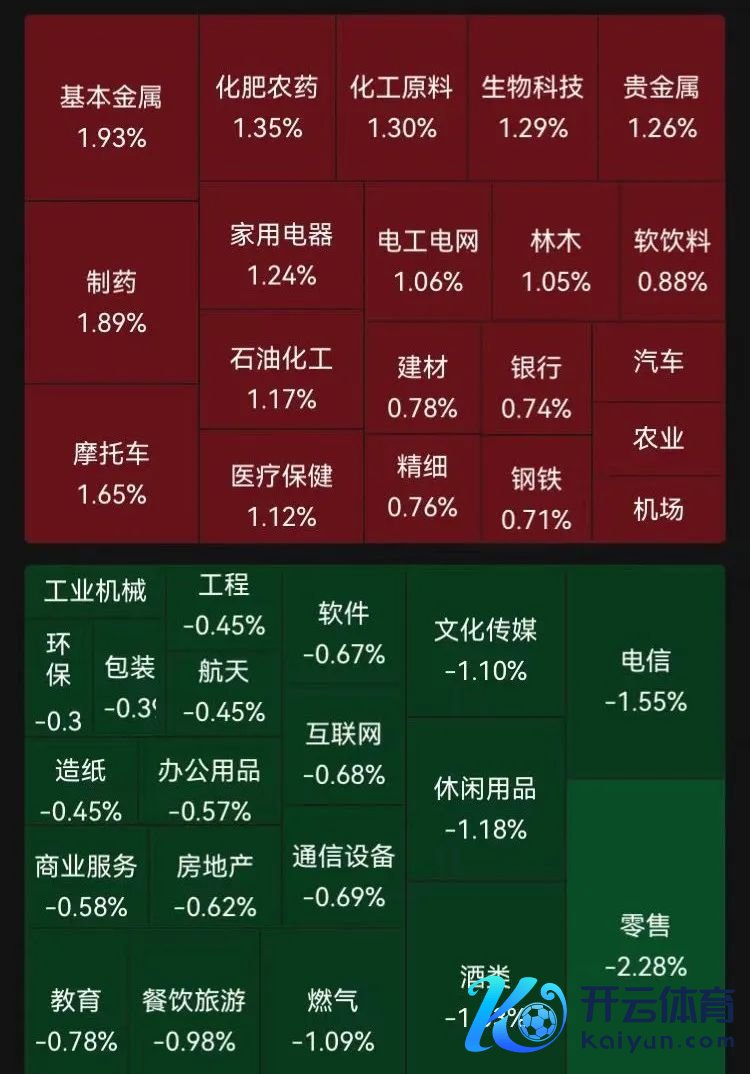 板块方面,基本金属、制药、摩托车涨幅居前,家用电器、医疗保健等拉升,零卖、电信、酒类跌幅居前。