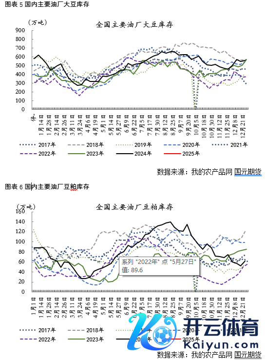 确认海关数据显现,国内大豆入口量合座保执较高水平,11月和12月入口量区分为715.4万吨和794.1万吨,1月料到为650万吨。尽管11月入口量略有下落,但12月有所回升,合座供应鼓胀。2024全年中国大豆入口总量已打破1亿吨,达到1.05亿吨,同比增长6.5%。确认钢联数据显现,2025年1月份国内全样本油厂大豆到港预估112船,计较约728万吨(本月船重按6.5万吨计)。合座来看,2024年四季度于今国内入口大豆供应较为充裕,同期确认Mysteel农居品对寰宇动态全样本油厂走访情况显现,第2周(1月4日至1月10日)油厂大豆本体压榨量193.41万吨,开机率为54.37%;较预估高3.25万吨,油厂看护相对高开机率,豆粕供应预期偏宽松。