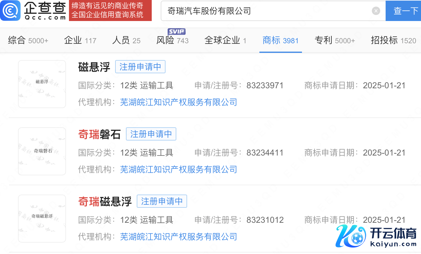 企查查APP表现,近日,奇瑞汽车股份有限公司苦求注册“磁悬浮”“奇瑞磁悬浮”商标,外洋分类均为运载器用,面前商标景况均为注册苦求中。